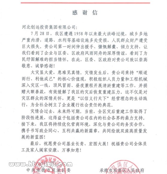 近日,承德市雙灤區(qū)區(qū)委、區(qū)政府向河北創(chuàng)遠投資集團發(fā)來感謝信,對創(chuàng)遠集團在今年抗洪搶險期間第一時間伸出援手、與區(qū)委、區(qū)政府和當(dāng)?shù)厝罕婏L(fēng)雨同舟的深厚情誼,表達了誠摯的感謝。
